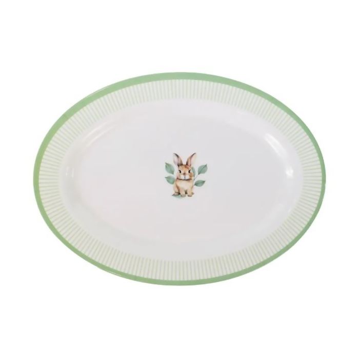 Descrição Bandeja Oval Melanina Coelho Branco e Verde 35cm