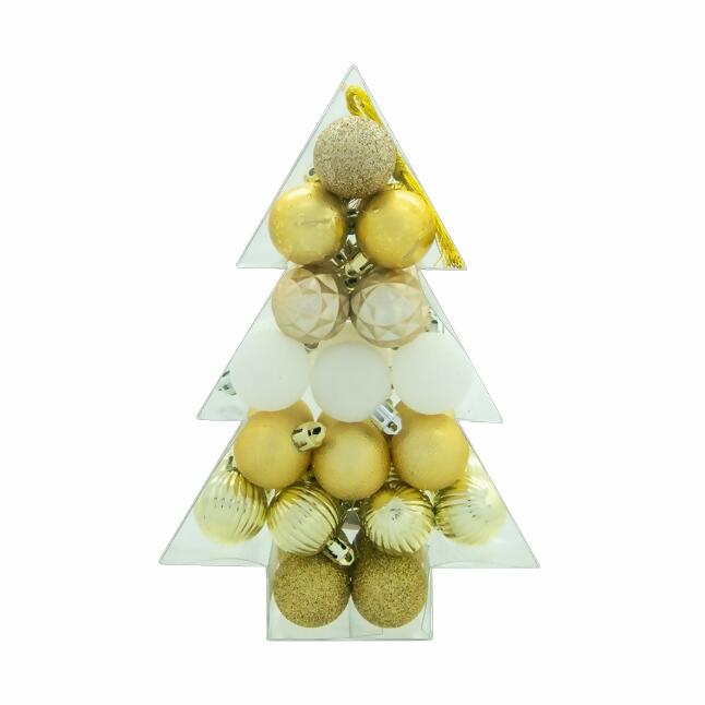 Descrição Bolas Mix Caixa Árvore 3cm Dourada e Branca 34 Unidades