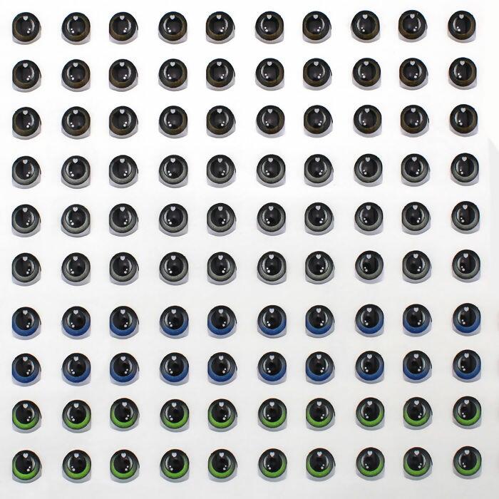 Cartela com 80 pares de olhos adesivos sortidos em vinil com leve camada de resina deixando-o em alto relevo e com aspecto de vidro. A cartela possui 80 pares de olhos divididos em 4 opções de cores.