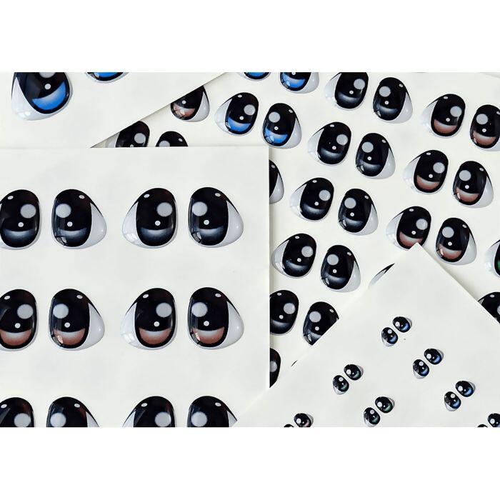 Cartela de adesivos, em material de vinil, a prova d'agua, já recortados e ideal para peças artesanais de EVA, biscuit, papel, tecido e feltro. São olhinhos com uma camada de resina (alto relevo que imita vidro).