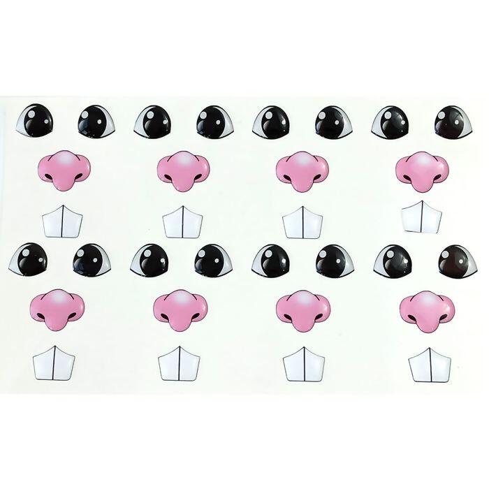 Cartela de adesivos, em material de vinil, a prova d'agua, já recortados e ideal para peças artesanais de EVA, biscuit, papel, tecido e feltro. São olhinhos + focinhos + dentinhos com uma camada de resina (alto relevo que imita vidro)