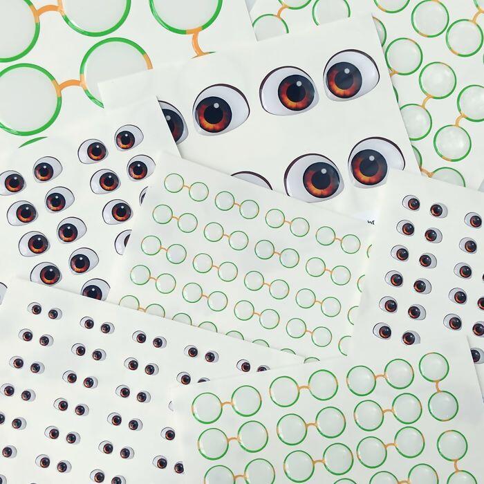 São duas cartelas de adesivo de 14cm x 12cm, 1 de olhos e 1 de óculos.