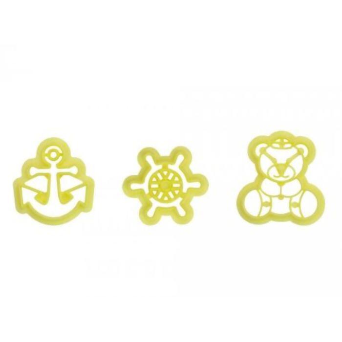 São três cortadores de tamanho 7,2 x 7,0cm: ursinho marinheiro, roda do leme e âncora. Faça velas, apliques para bolos e doces e o que mais você quiser!