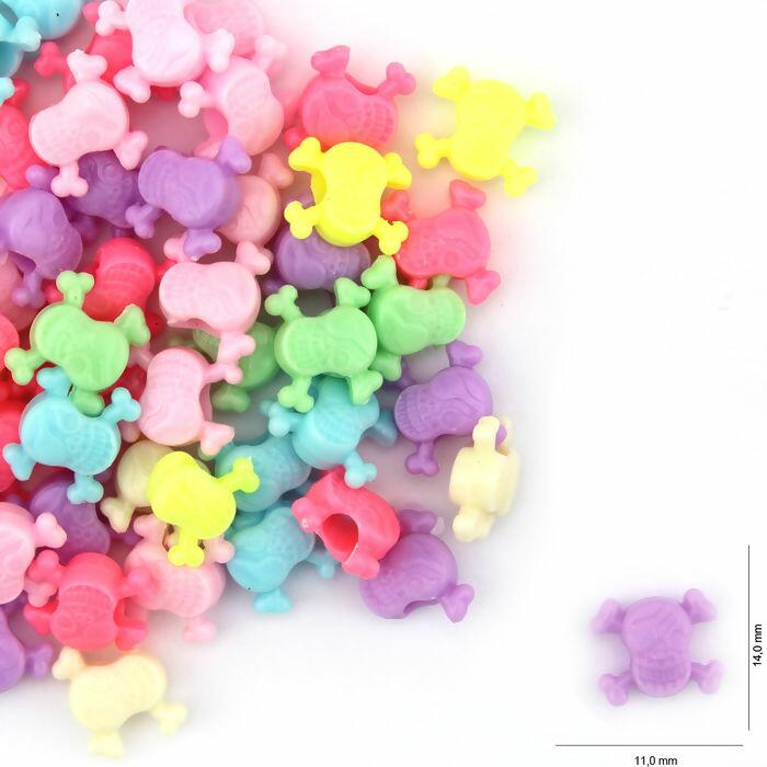 Entremeio em formato de caveira de 11mm x 14mm nas cores candy color em tons pastel, ideal para confecção e customização de pulseiras, bijuterias e outros acessórios.