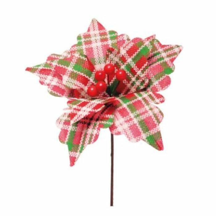 Flor de Natal Poinsétia Cabo Curto Xadrez Vermelho Verde e Ouro