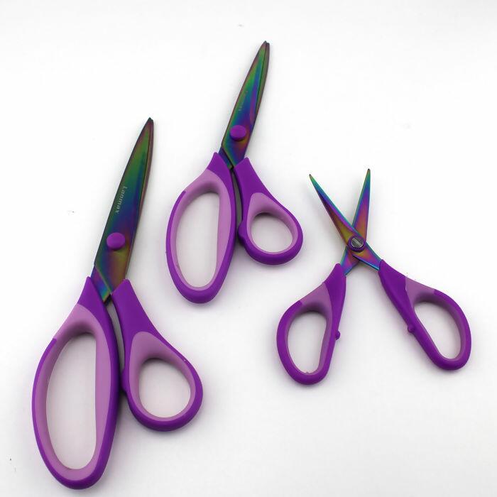 Conjunto com três tesouras multi uso revestidas em titânio para diversos tipos de materiais. Contém: