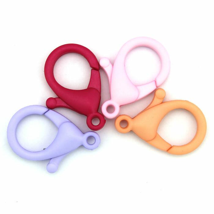 Fecho mosquetão tipo lagosta, colorido, produzido em plástico, com 35 mm de comprimento e 25 mm de largura para confecção e customização de acessórios.