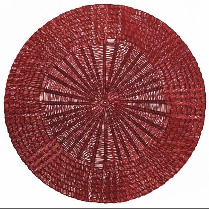 Lugar americano redondo trançado com bordas enfeitadas com azeitonas de madeira na cor vermelha.
