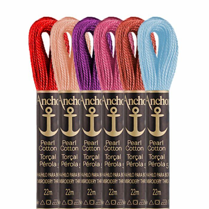 Anchor Perlé 5 é uma linha de bordar extremamente bem torcida a 2 cabos, brilhante e sedosa. São meadas com 22 metros, sendo que a linha é um pouco mais grossa do que a Anchor Perlé 8 (novelinhos). O brilho de Anchor Perlé 5 é sua maior qualidade, além do toque macio do algodão importado. É indicada para bordado livre, ponto cruz, vagonite e especialmente para o ponto reto e hardanger. Para que a linha mantenha as características de brilho e cor, recomendamos usar no máximo 45cm. de linha na agulha.