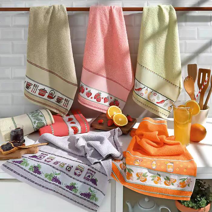 Pano de copa com barra decorada, encorpado e de ótima absorção para ser seu aliado na cozinha. A barra contém 40 pontos livres disponíveis na altura da mesma.