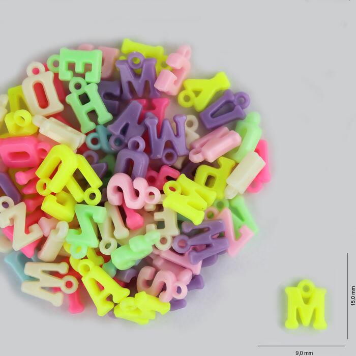 Pingente de letras sortidas produzidas em acrílico, coloridos, ideal para confecção e customização de pulseiras, bijuterias, chaveiros, lembrancinhas e outros artesanatos.