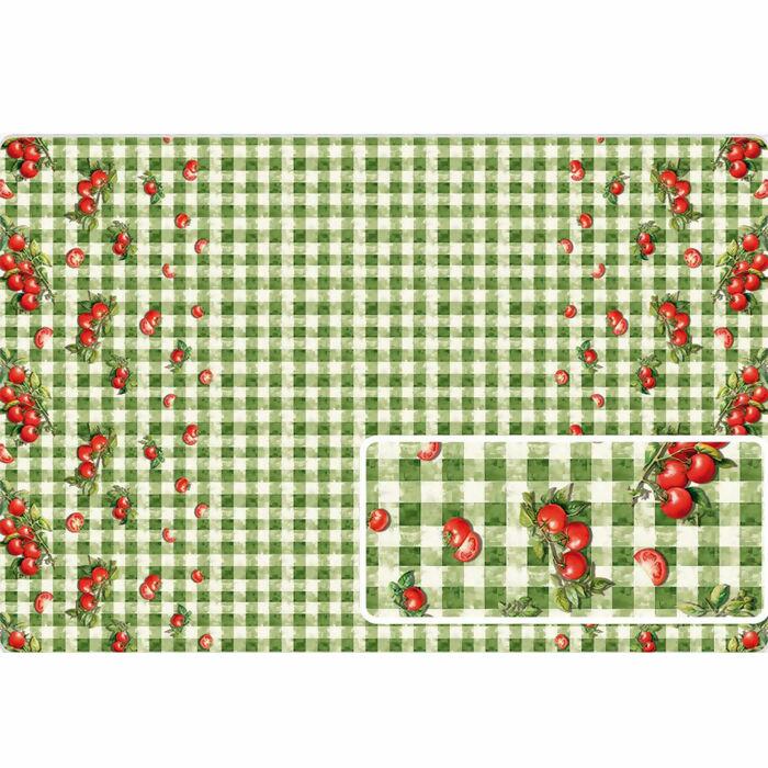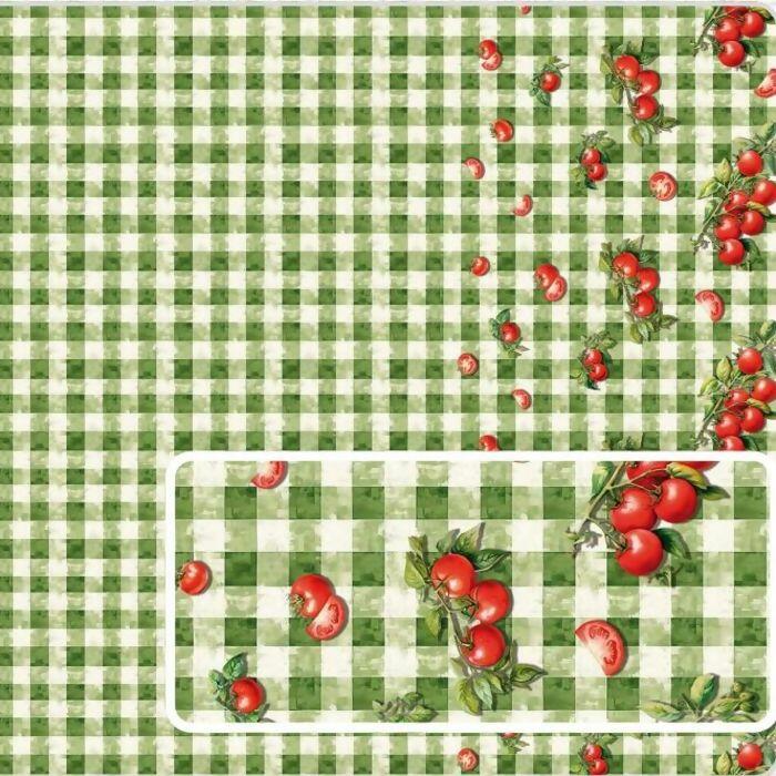 Descrição Tecido Sarja Digital Tomates Fundo Xadrez Verde