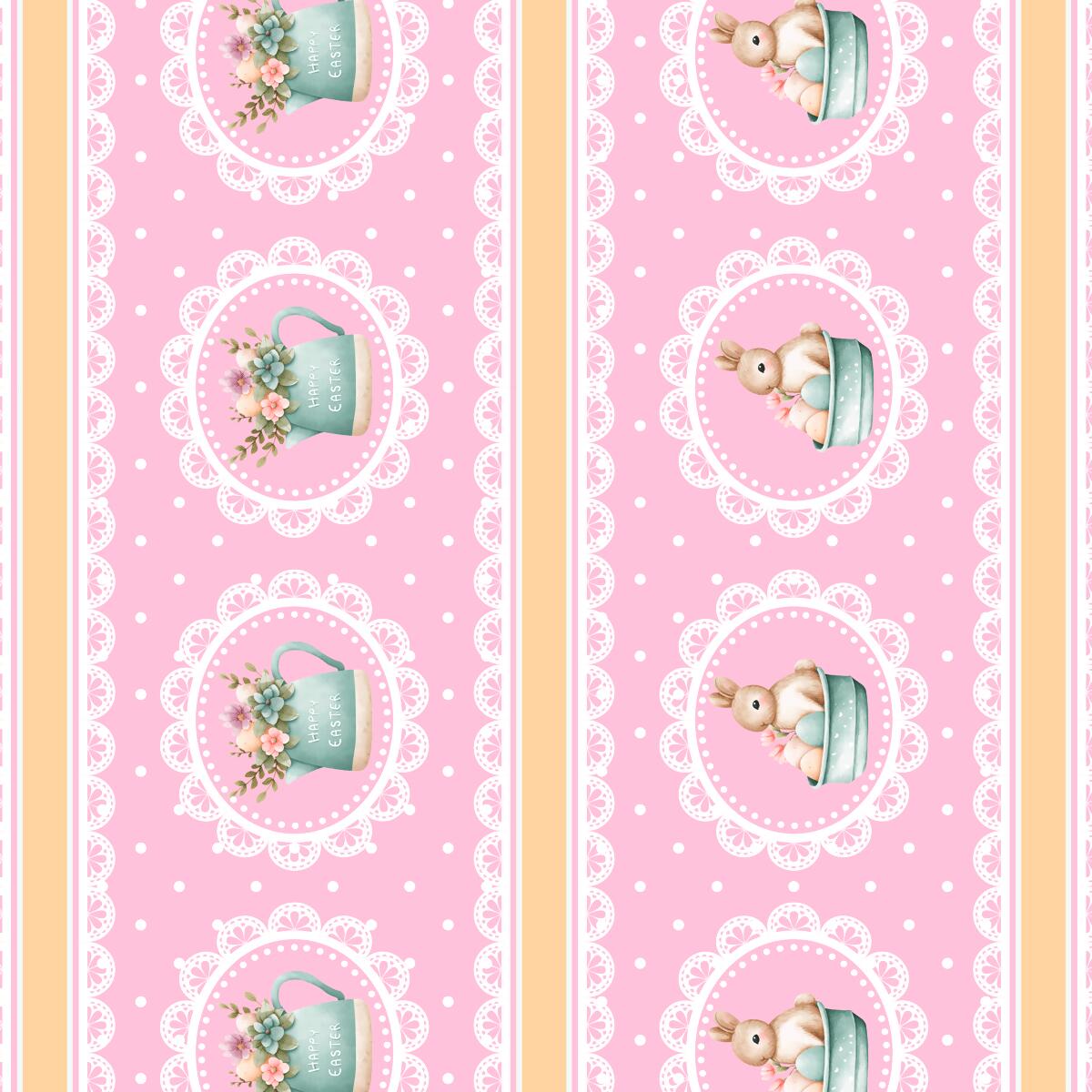 Tecido Tricoline Barrado Páscoa Coelho e Bule Fundo Rosa