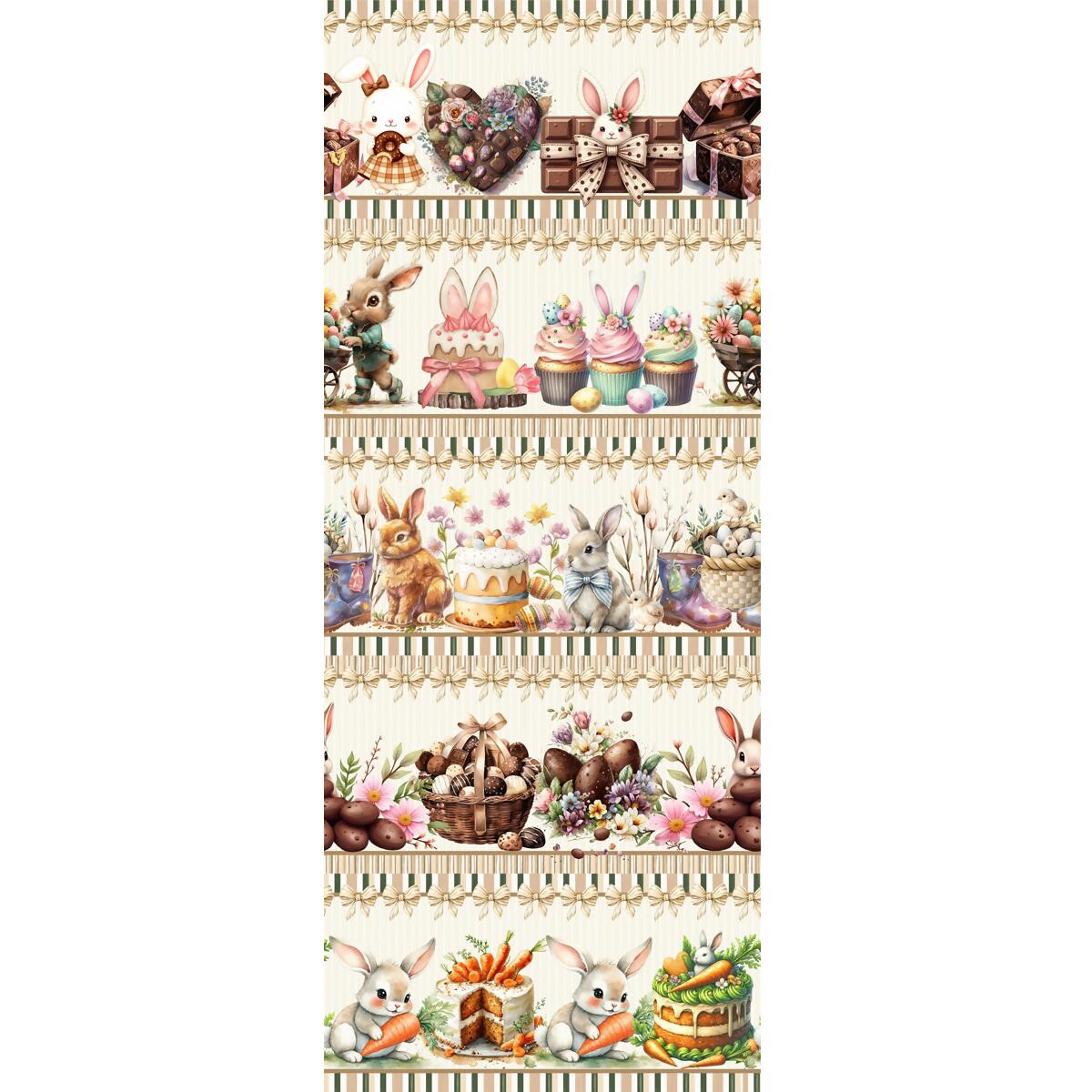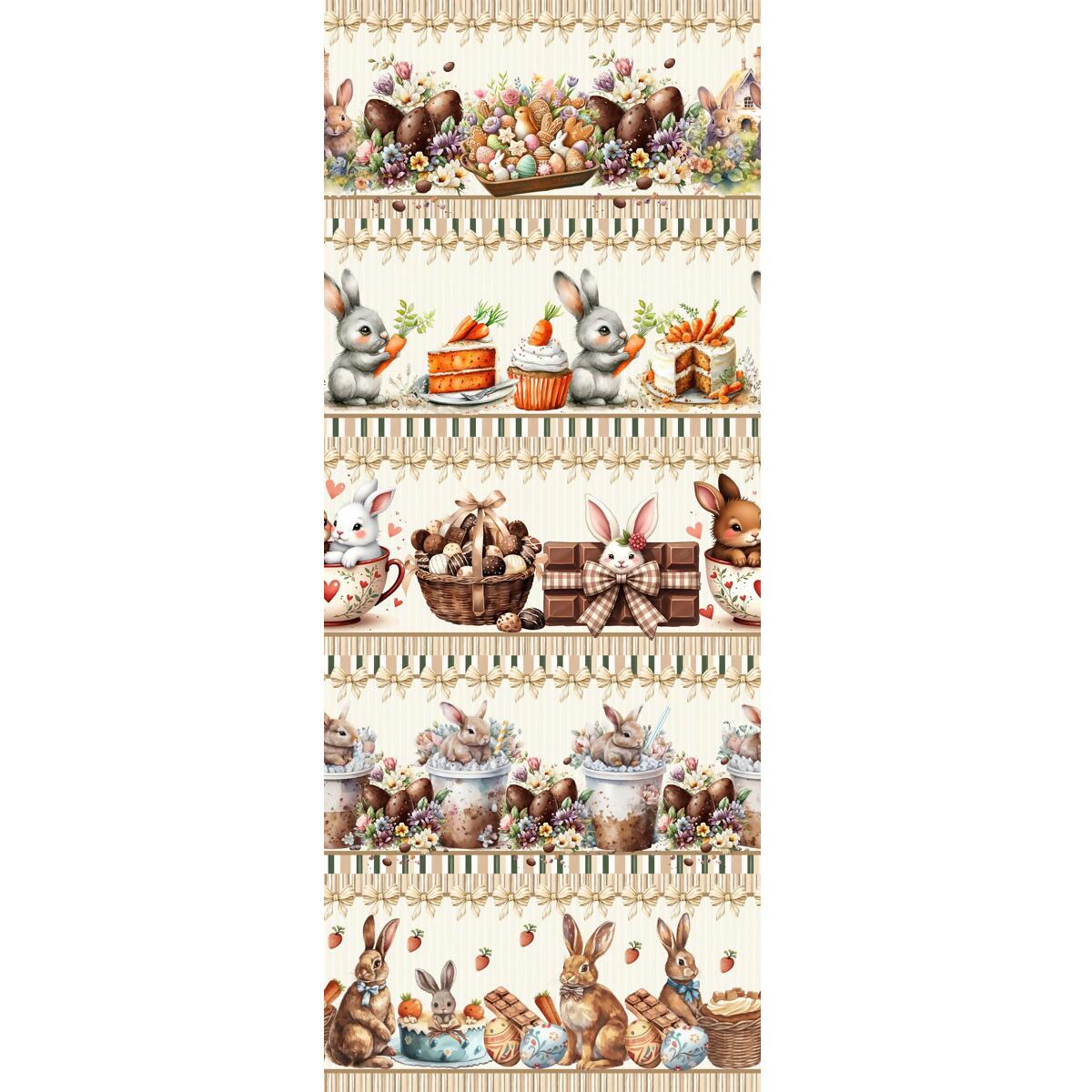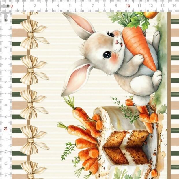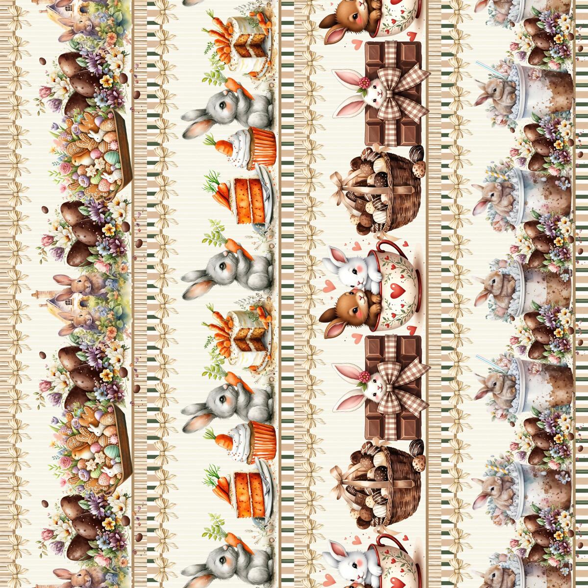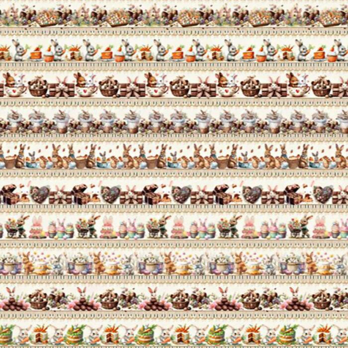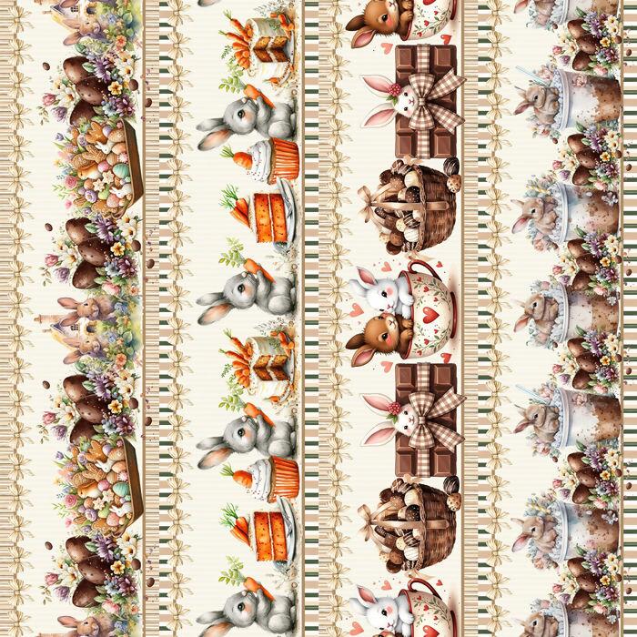 Descrição Tecido Tricoline Barrado Páscoa Coelhos e Ovos de Chocolate