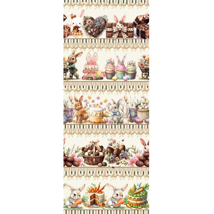 Tecido Tricoline Barrado Páscoa Coelhos e Ovos de Chocolate