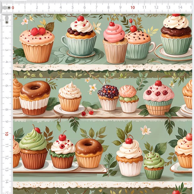 Descrição Tecido Tricoline Cupcake Fundo Verde