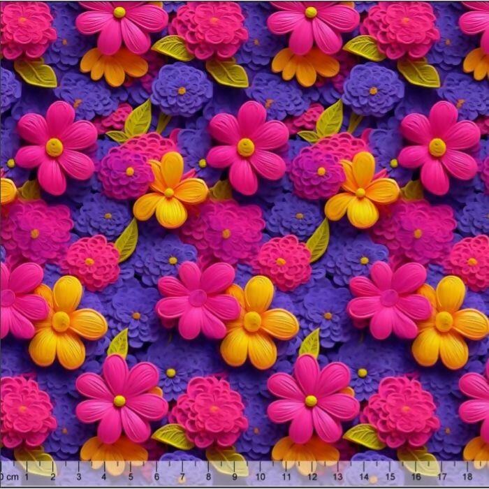 Descrição Tecido Tricoline Digital 3D Bordado Flores Coloridas