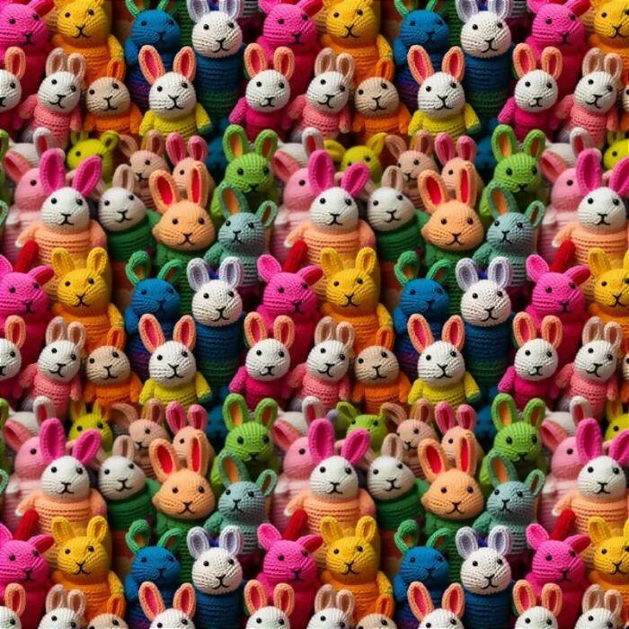 Descrição Tecido Tricoline Digital 3D Coelhos Crochê