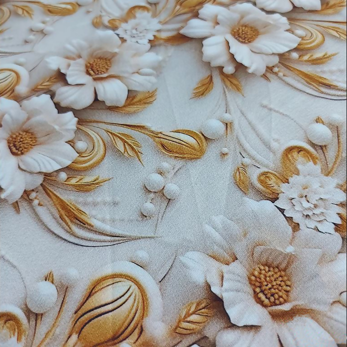 Descrição Tecido Tricoline Digital 3D Floral Dourado
