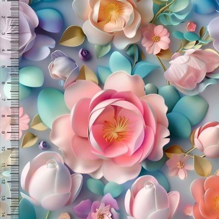 Descrição Tecido Tricoline Digital 3D Flores Salmão Lilás