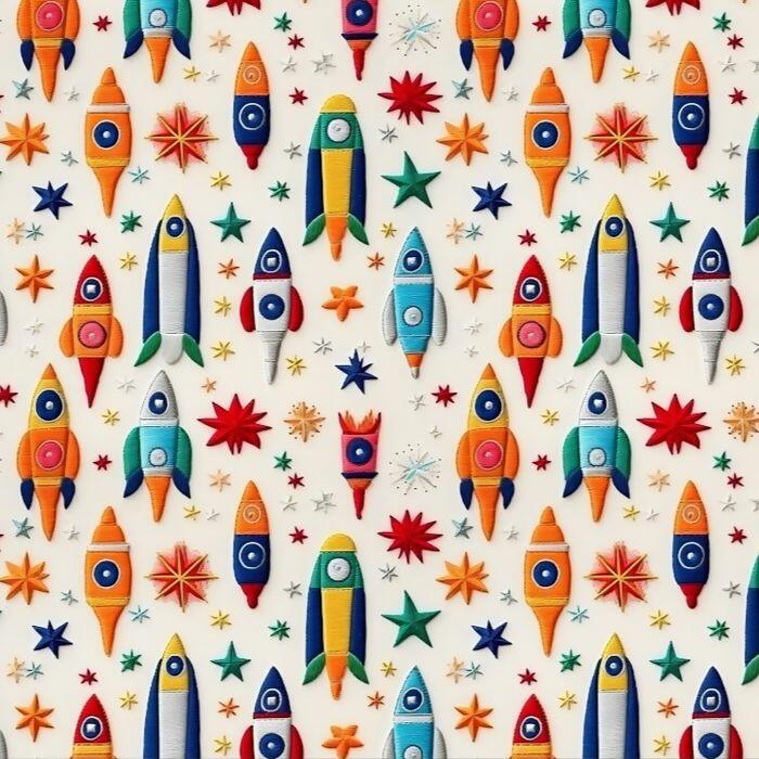 Descrição Tecido Tricoline Digital 3D Foguete Fundo Bege