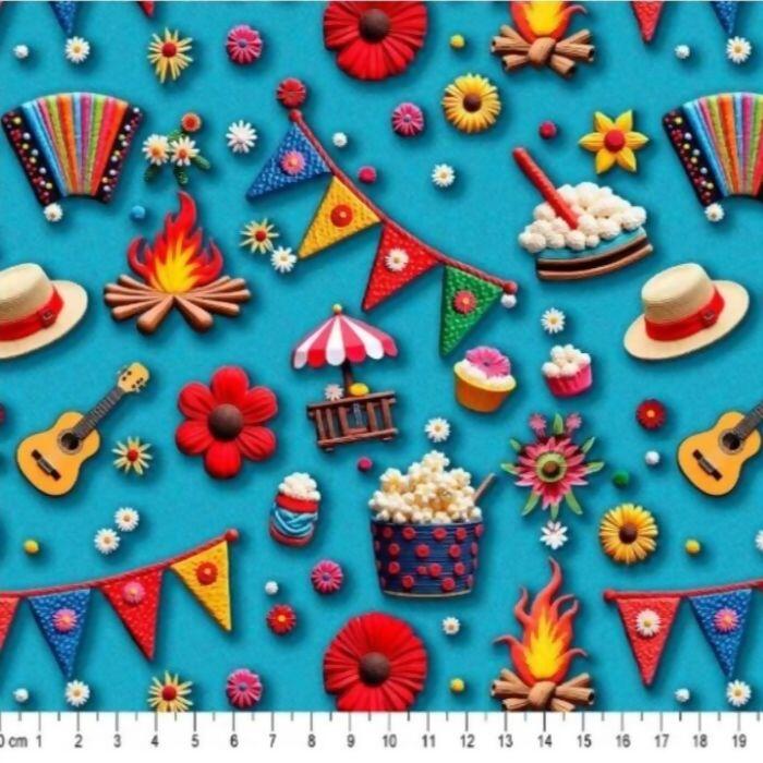 Descrição Tecido Tricoline Digital 3D Junino Arraiá Fundo Azul