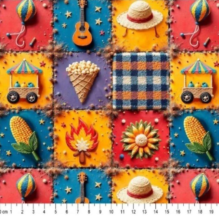 Tecido Tricoline Digital 3D Junino Arraiá Quadrados