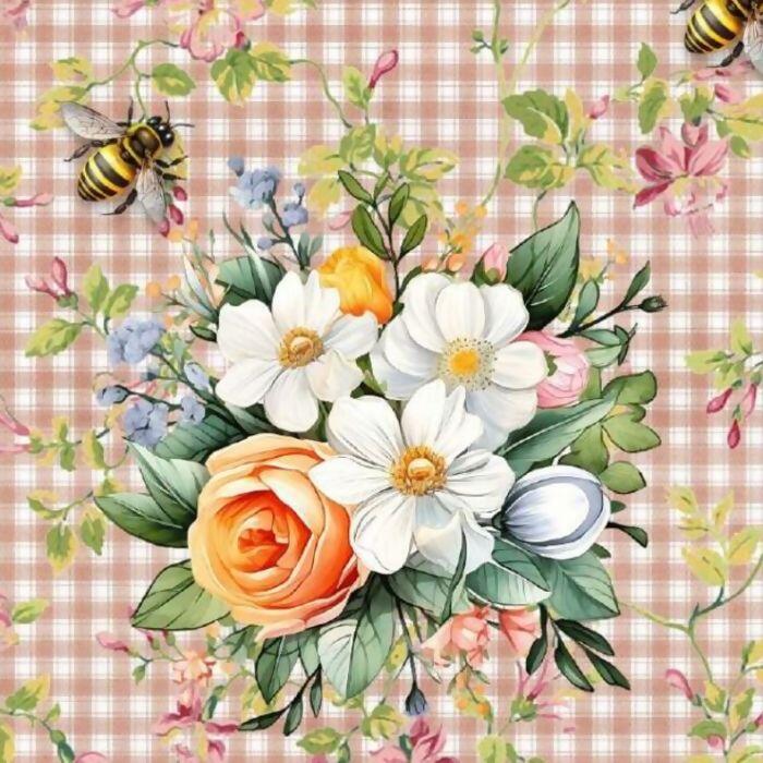 Descrição Tecido Tricoline Digital Abelhas Floral Fundo Xadrez