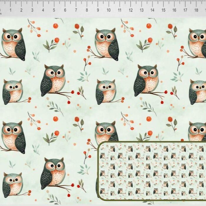 Descrição Tecido Tricoline Digital Acquared Corujas Fundo Verde