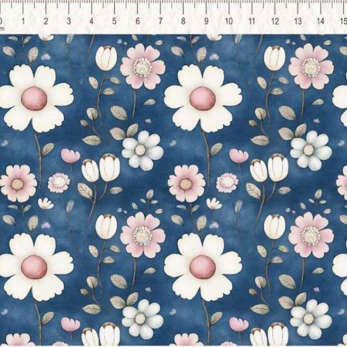 Tecido Tricoline Digital Amandita Flor Azul