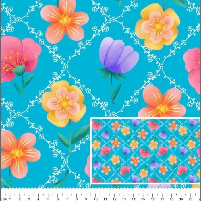 Descrição Tecido Tricoline Digital Azulejo Flor Detalhe Branco