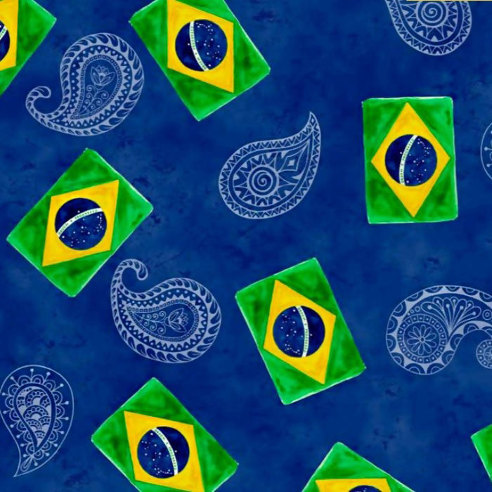 Tecido Tricoline Digital Bandeira do Brasil Arabesco Azul