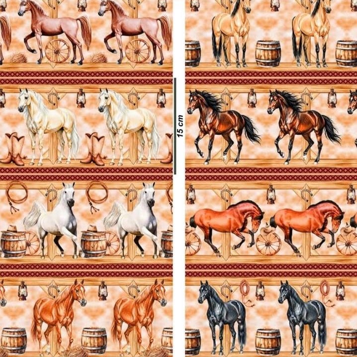 Tecido Tricoline Digital Barrado Cavalos e Barril