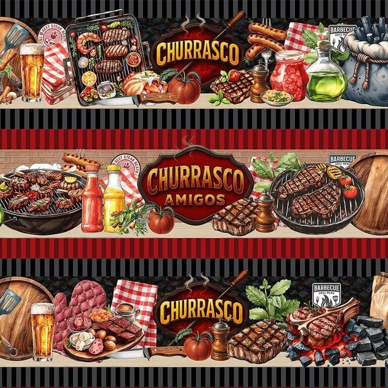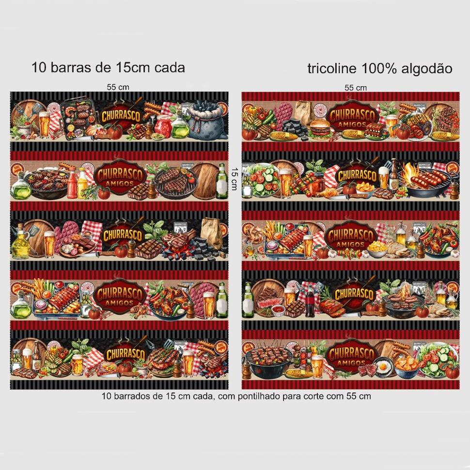 Descrição Tecido Tricoline Digital Barrado Churrasco e Amigos