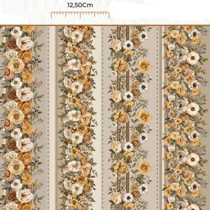 Descrição Tecido Tricoline Digital Barrado Flores Camurça
