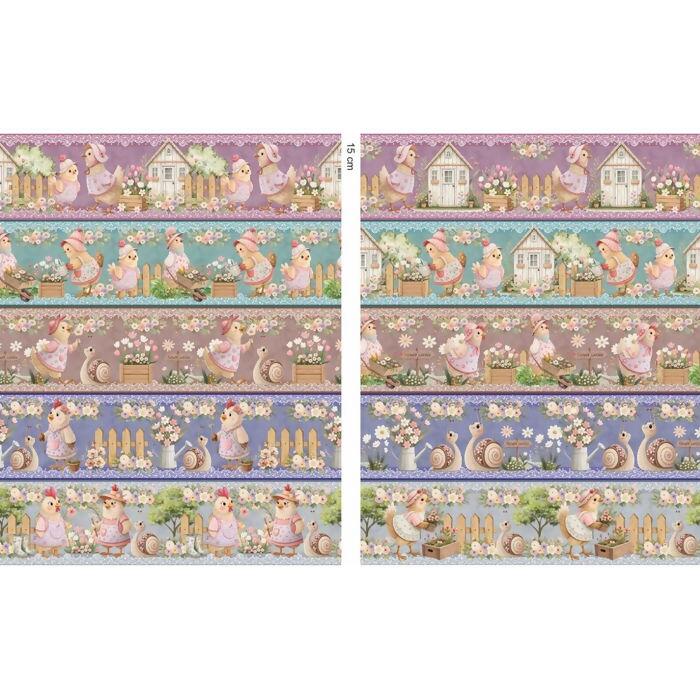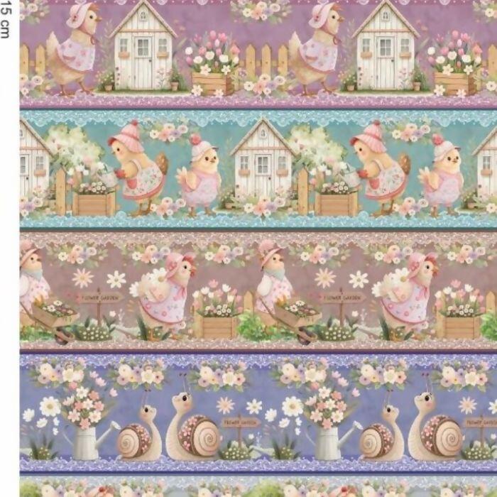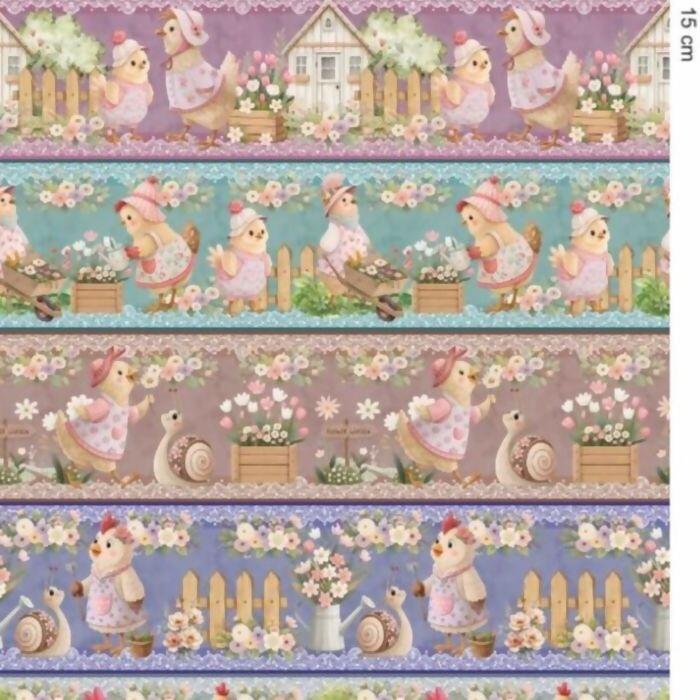 Descrição Tecido Tricoline Digital Barrado Galinhas e Caracóis