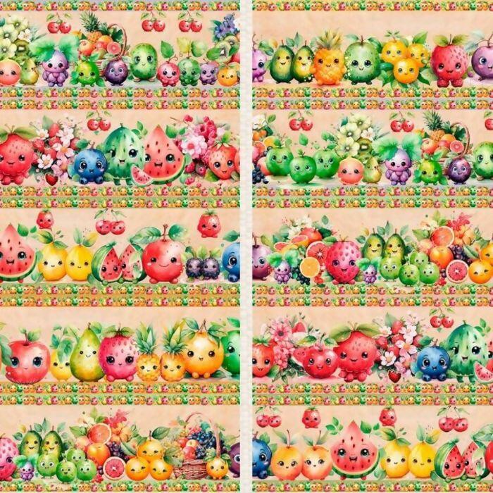 Descrição Tecido Tricoline Digital Barrado Jardim Frutas Mágicas