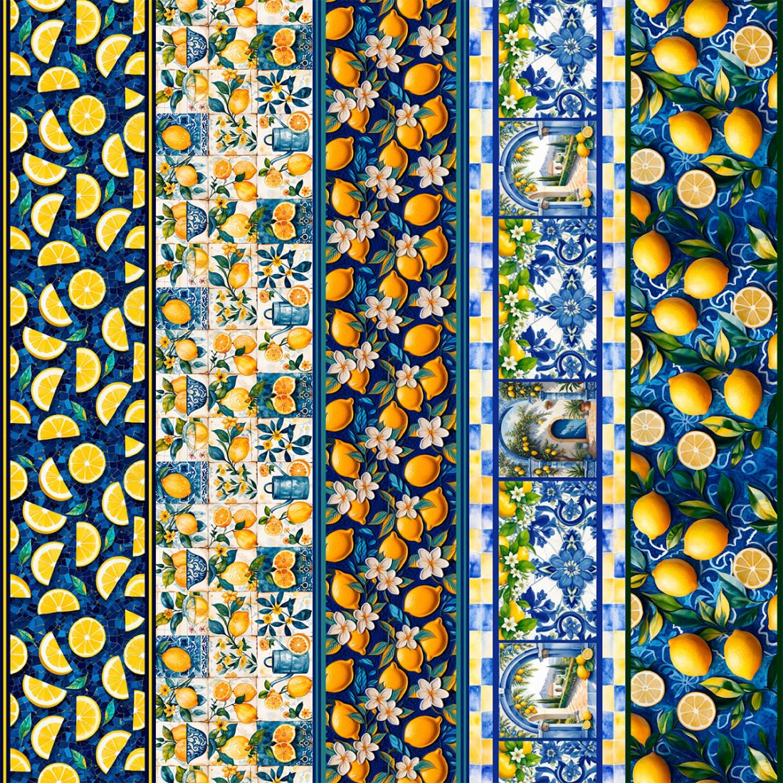 Tecido Tricoline Digital Barrado Limões Fundo Azul