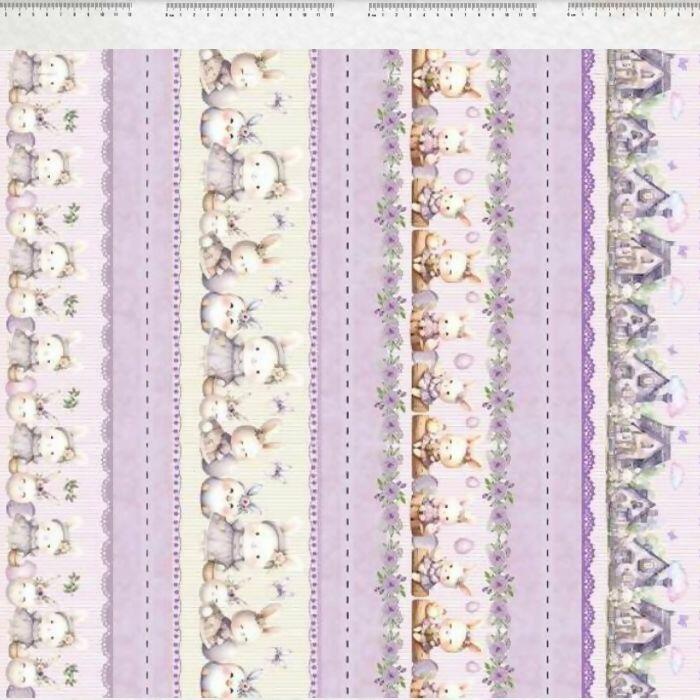 Tecido Tricoline Digital Barrado Páscoa Coelha e Casa Lilás