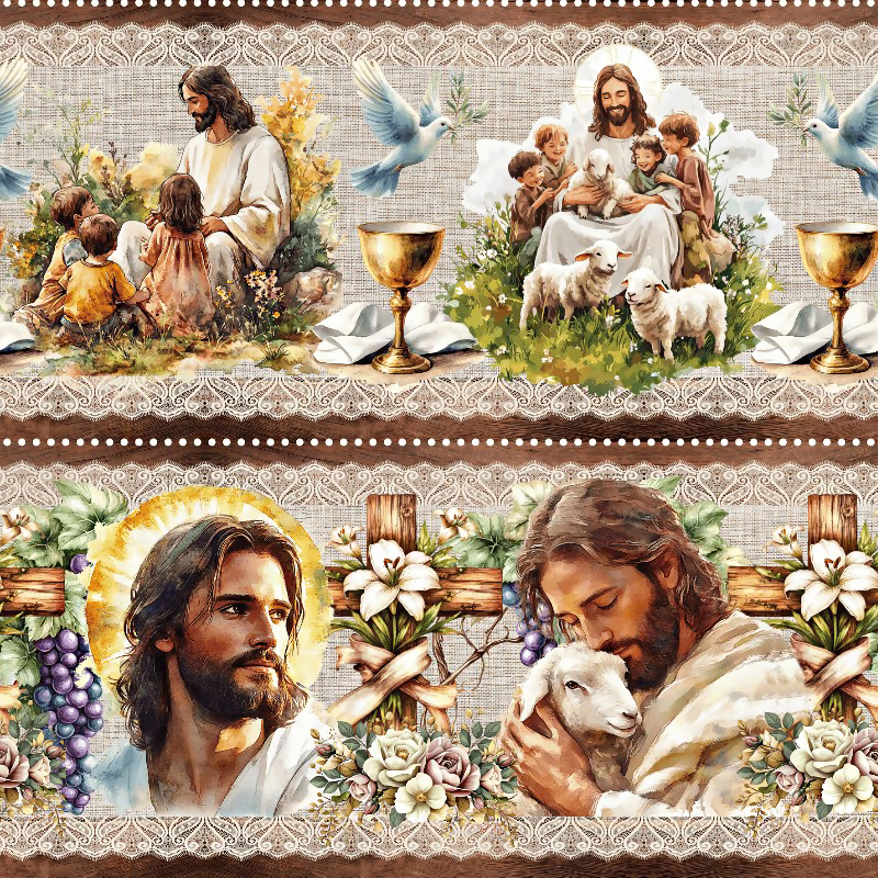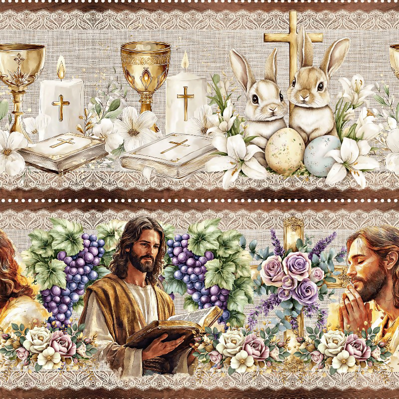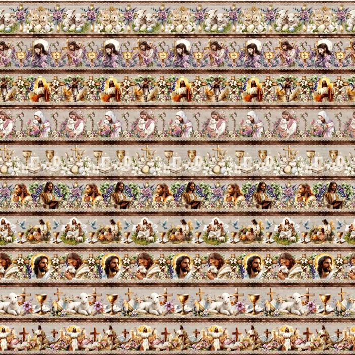Descrição Tecido Tricoline Digital Barrado Páscoa Coelhinhos e Jesus