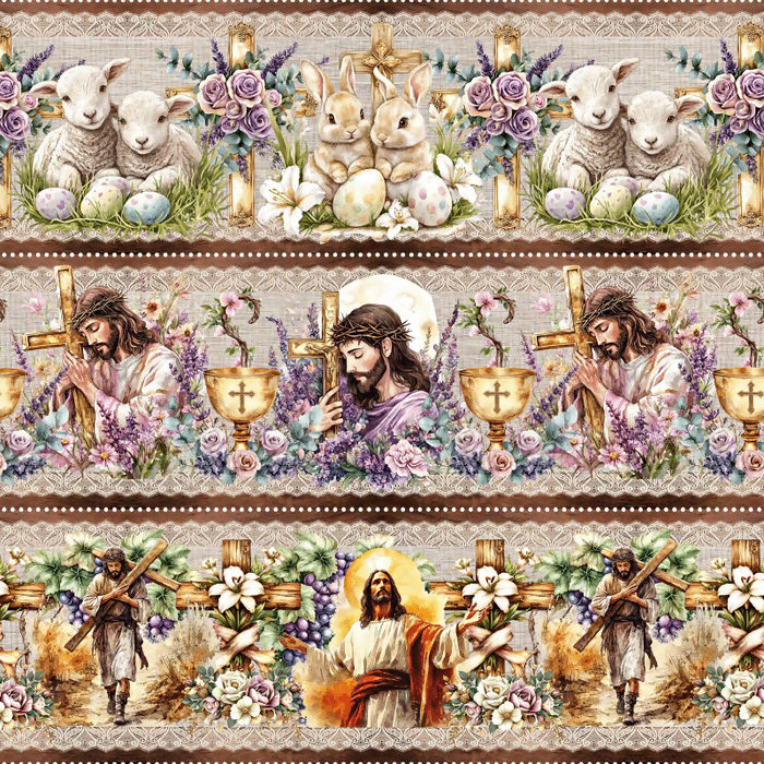 Tecido Tricoline Digital Barrado Páscoa Coelhinhos e Jesus