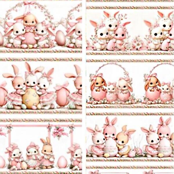 Descrição Tecido Tricoline Digital Barrado Páscoa Coelho e Cesta Rosa
