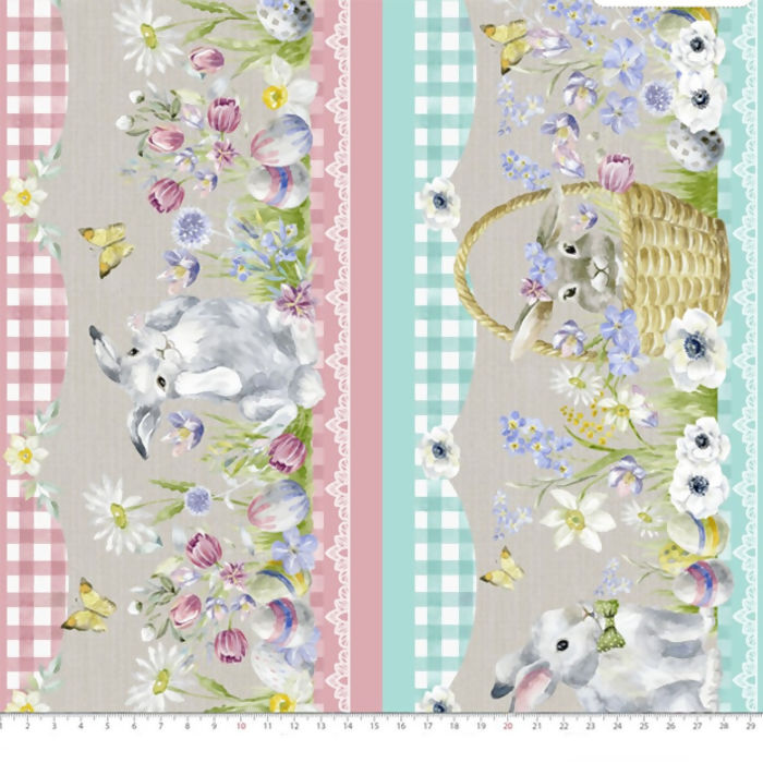 Tecido Tricoline Digital Barrado Páscoa Coelho Flores Cesta