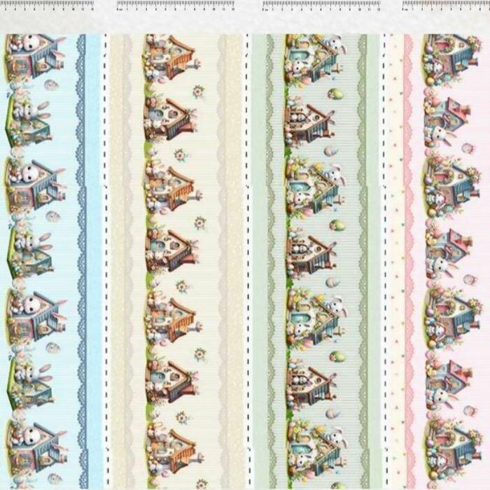 Tecido Tricoline Digital Barrado Páscoa Coelhos e Casinhas