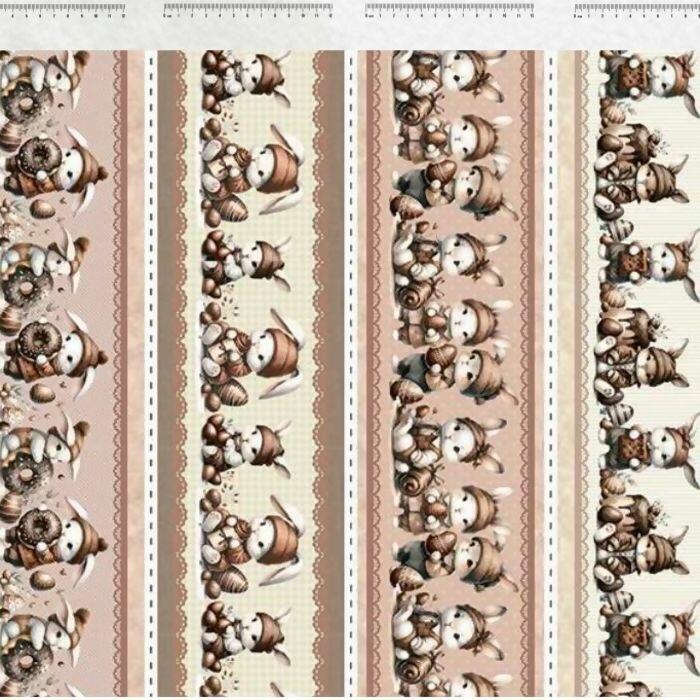 Descrição Tecido Tricoline Digital Barrado Páscoa Coelhos e Chocolate