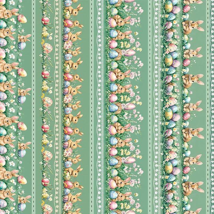 Tecido Tricoline Digital Barrado Páscoa Coelhos Fundo Verde