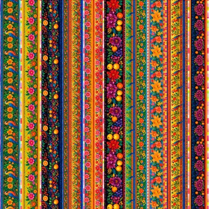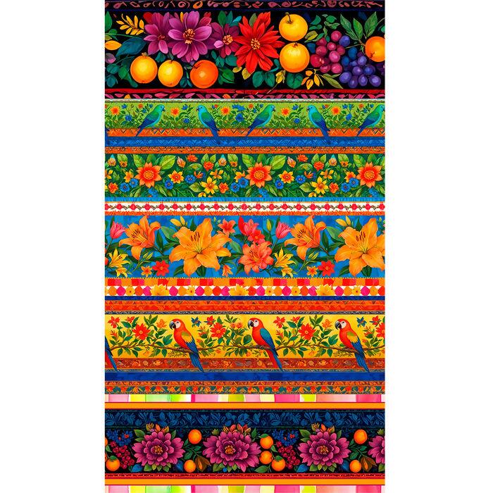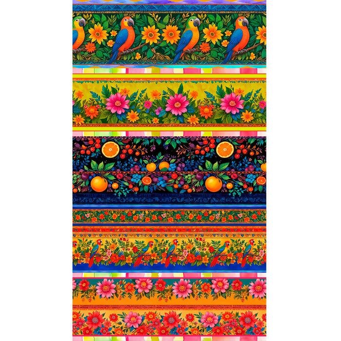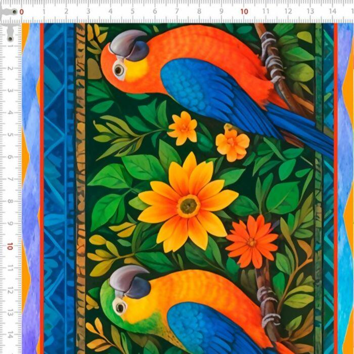 Descrição Tecido Tricoline Digital Barrado Pássaros Frutas e Flores
