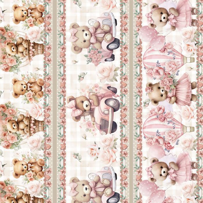 Descrição Tecido Tricoline Digital Barrado Ursinhos Rosa Fundo Bege