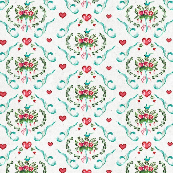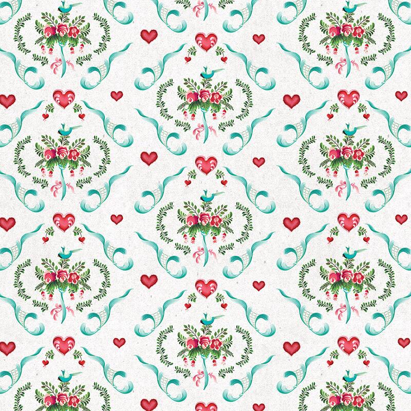 Descrição Tecido Tricoline Digital Bauernmalerei Arabesco Rosa e Coração | Premium