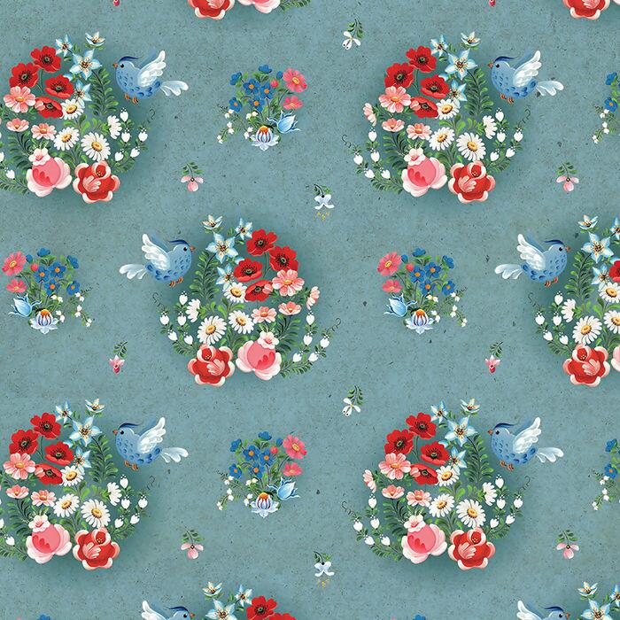 Descrição Tecido Tricoline Digital Bauernmalerei Flores e Pássaros e Fundo Azul | Premium